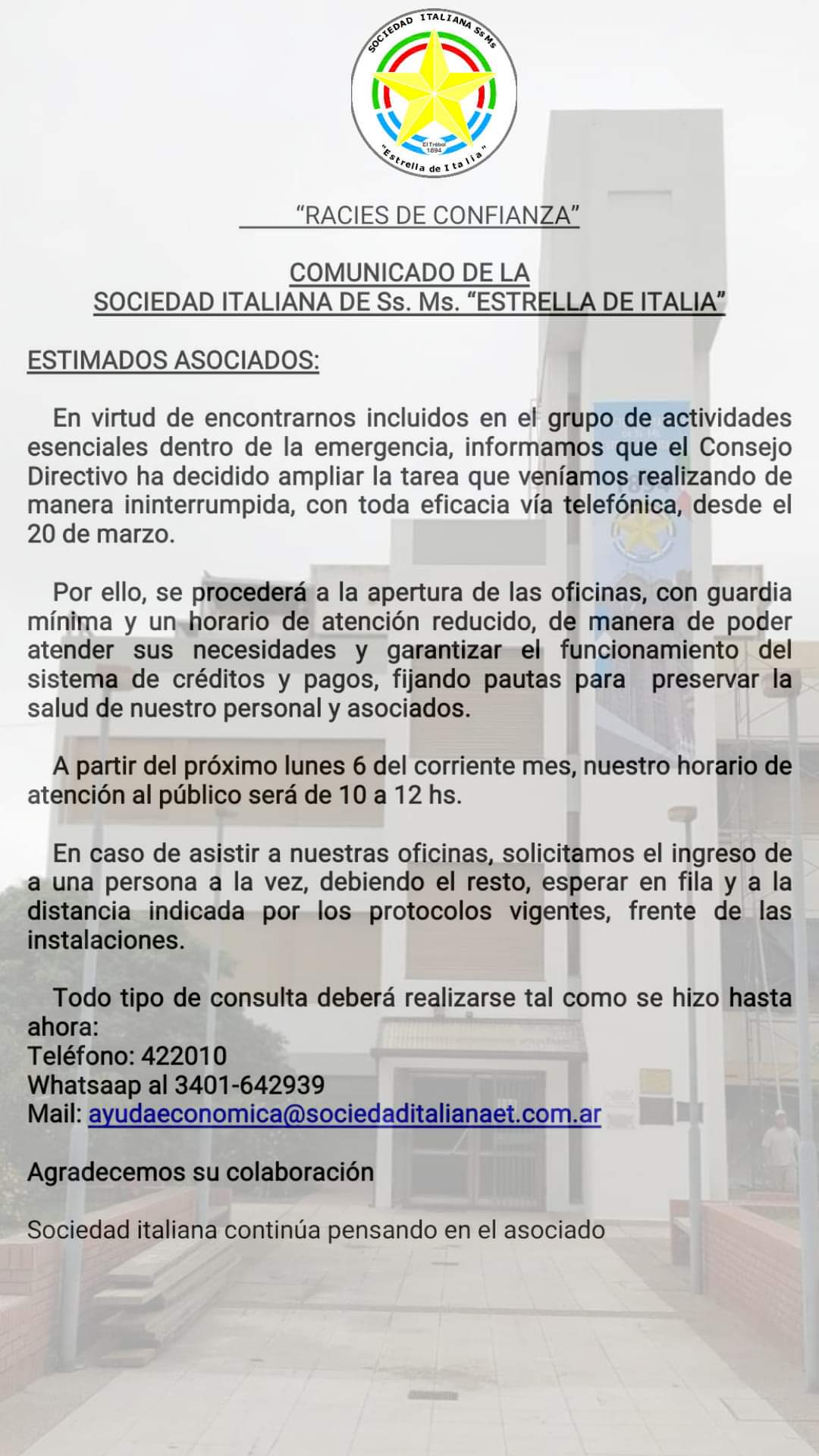 Por ello, se procederá a la apertura de las oficinas, con guardia mínima y un horario de atención reducido, de manera de poder atender sus necesidades y garantizar el funcionamiento del sistema de créditos y pagos, fijando pautas para preservar la salud de nuestro personal y asociados.