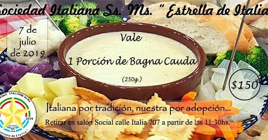 Ya está a la venta la Bagna Cauda de Sociedad Italiana 14/06/2019 El próximo 7 de julio no te podes perder la Bagna Cauda de Sociedad Italiana, la venta esta a cargo de la Comisión Directiva y de los talleres del espacio cultural italo argentino… Italiana por tradición, nuestra por adopción